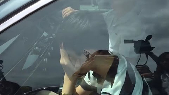 Công dân Triều Tiên Ri Jong-chol (lấy tay che mặt) trên ô tô đến sân bay để trục xuất. Photo Courtesy: Star TV