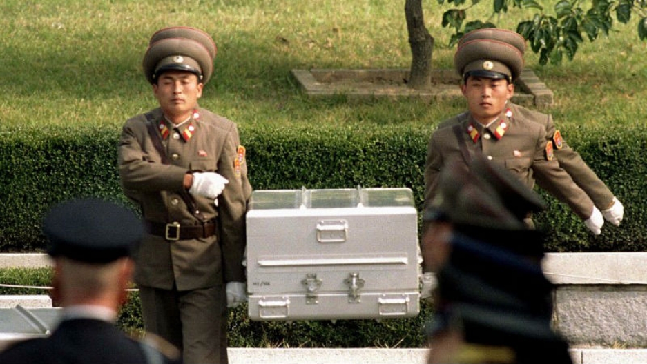 Binh lính Triều Tiên khiêng cỗ quan tài được tin là hài cốt của lính Mỹ trao trả lại cho Washington hồi năm 1998. Photo Courtesy: Yun Suk Bong/Reuters