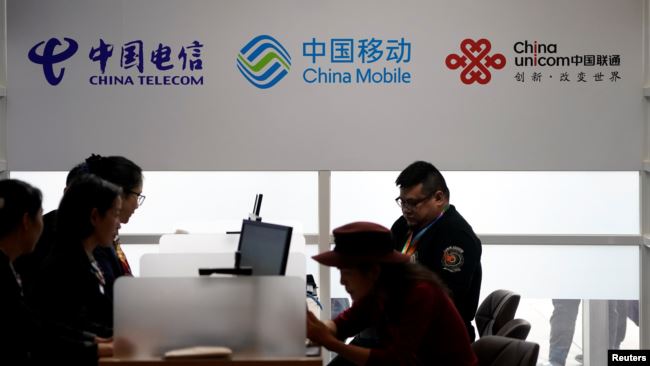 Tư liệu: Bảng hiệu China Telecom, China Mobile và China Unicorn tại Triển Lãm Quốc tế TQ ở Thượng Hải, ngày 5/11/2018. Photo courtesy: REUTERS/Aly Song