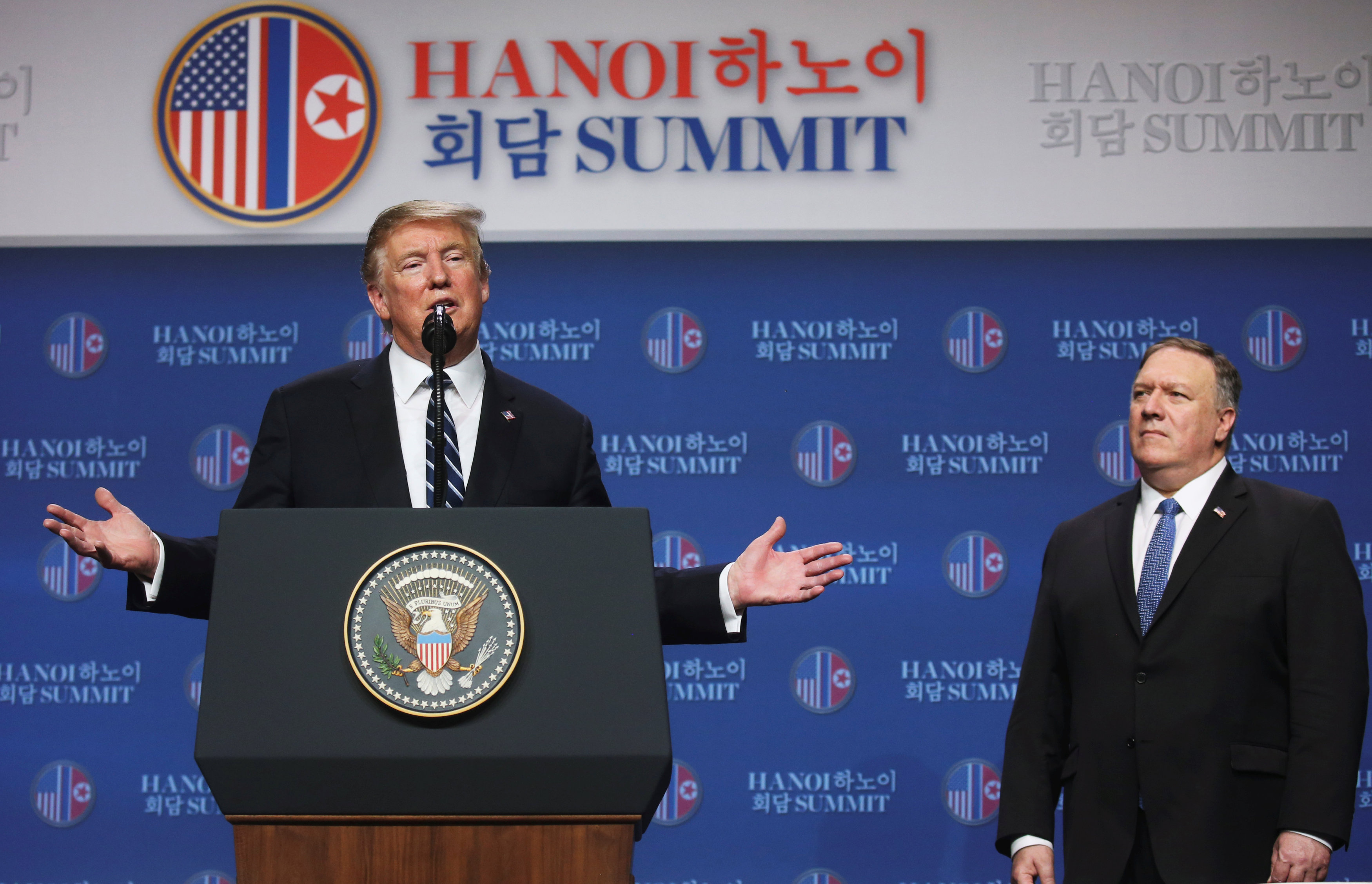 Tổng thống Donald Trump và Ngoại trưởng Mike Pompeo trong buổi họp báo tại Hà nội. Photo Courtesy: Reuters Tổng thống Mỹ Donald Trump cho biết, ông và Chủ tịch Triều Tiên Kim Jong-un đã không đạt được thỏa thuận chung sau các cuộc đàm phán kéo dài 2 ngày tại Hà Nội do bất đồng liên quan tới lệnh trừng phạt đối với Triều Tiên. Hội nghị kết thúc sớm hơn dự kiến sau khi lễ ký thỏa thuận và bữa trưa làm việc bị hủy bỏ.