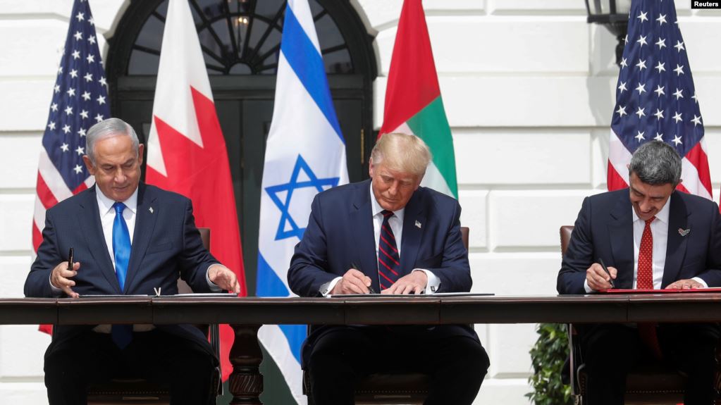 (2/4) Tổng Thống Trump chủ tọa lễ ký thỏa thuận bình thường hóa quan hệ giữa lãnh đạo UAE, Bahrain và Israel ngày 15/7/2020. Photo courtesy: Reuters