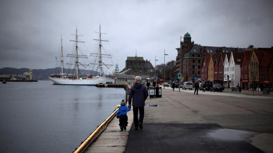 Một người đàn ông dắt một đứa trẻ dọc bến cảng thị trấn Bergen, Na Uy. Photo Courtesy: Reuters