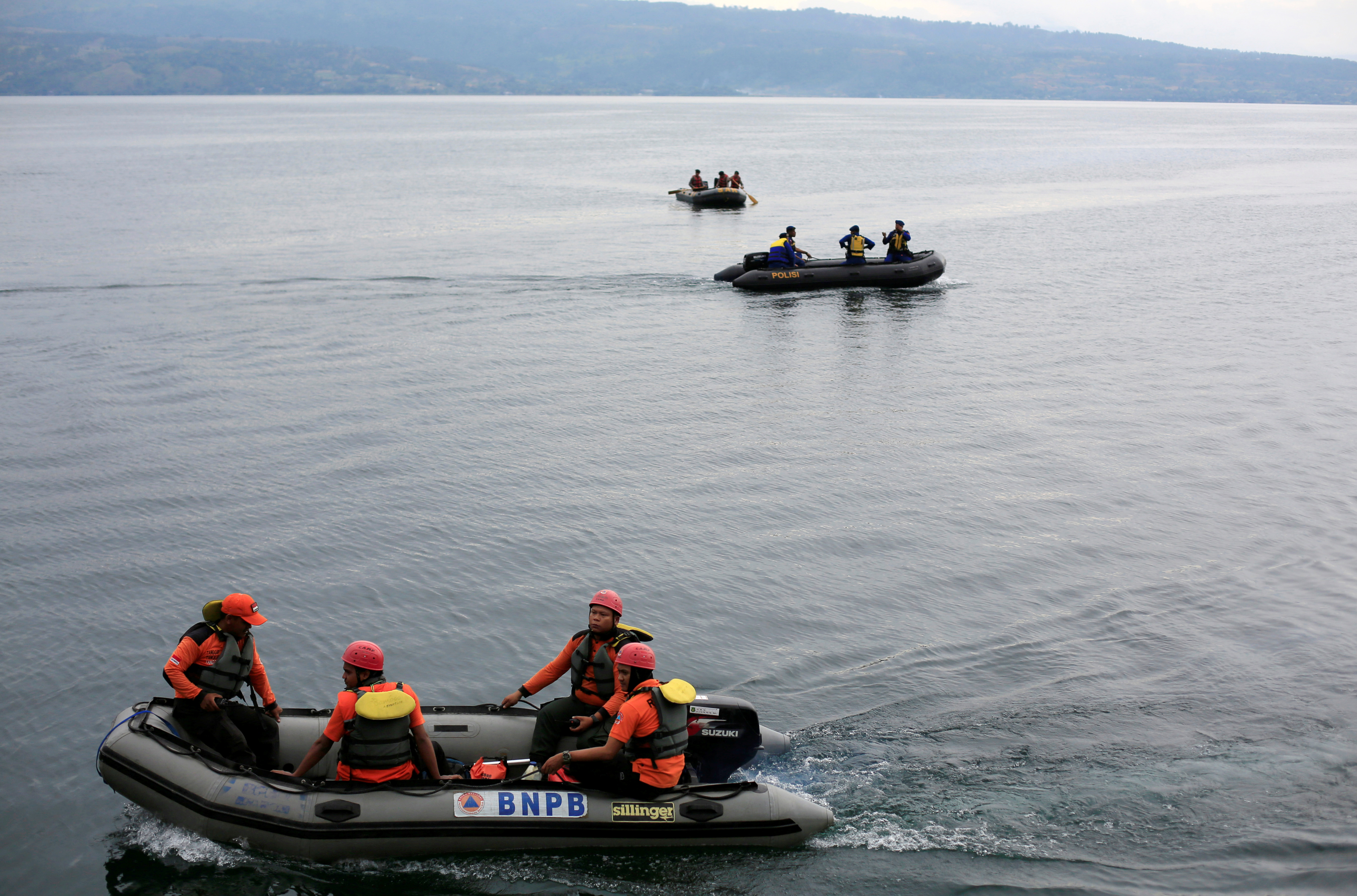 Lực lượng cứu hộ được triển khai tìm kiếm các nạn nhân vụ chìm thuyền tại hồ Toba ở Nam Dương ngày 21.6.2018. Photo Courtesy: Reuters Ngày 20.6, Bộ Giao thông vận tải Nam Dương quyết định tạm thời đình chỉ mọi hoạt động của các tàu thuyền du lịch trên hồ Toba nhằm tạo điều kiện cho Cơ quan Tìm kiếm và cứu hộ quốc gia (Basarnas) thực hiện việc tìm kiếm những người còn mất tích trong vụ chìm tàu vào chiều 18.6 vừa qua.