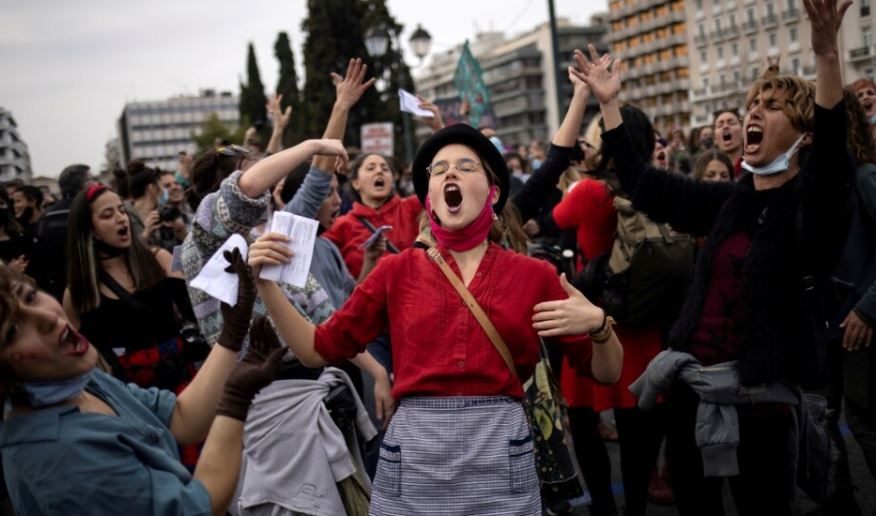 Người dân nhảy múa và ca hát kỷ niệm Ngày Quốc tế Phụ nữ trước Quốc hội tại Athens, Hy Lạp, ngày 8/3/2021. Photo courtesy: Reuters Hơn 100 năm nay, Ngày Quốc tế Phụ nữ được kỷ niệm bằng việc tôn vinh những thành tựu của nữ giới toàn cầu.