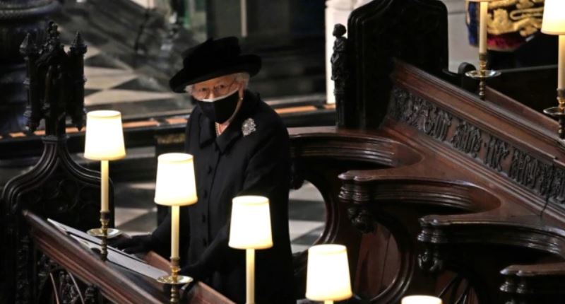 Nữ hoàng, mặc đồ đen và đeo khẩu trang đen viền trắng, đứng đơn độc, cúi đầu khi linh cữu người chồng 73 năm của bà được hạ xuống Mộ thất Hoàng gia của Nhà nguyện St George trong một buổi lễ có sự tham dự của các vị hoàng thân cao cấp bao gồm người thừa kế là Thái tử Charles.
