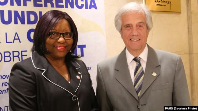 Bác sĩ Carissa Etienne, giám đốc Tổ chức Y tế Liên Mỹ (PAHO), trái, và Tổng thống Uruguay Tabare Vazquez.