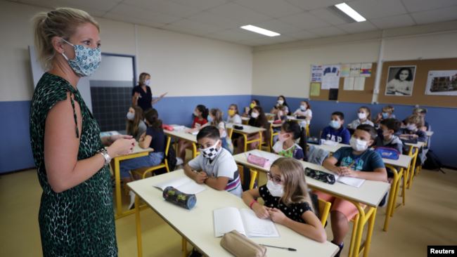 Lớp học trong mùa dịch COVID tại trường College Henri Matisse ở Nice, Pháp, ngày 1/9/2020. Photo courtesy: Reuters Trong hai ngày liên tiếp, Pháp báo cáo có thêm trên 7.000 ca nhiễm mới trong 24 giờ, Bộ Y tế cho biết hôm 3/9 trong khi số bệnh nhân nhập viện vì COVID cũng tăng trở lại.
