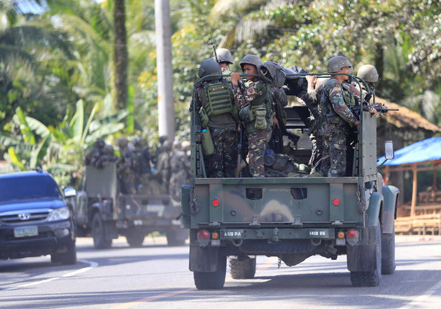 Binh sĩ Phi Luật Tân trên đường chi viện cho TP Marawi hôm 24.5. Photo Courtesy: Reuters Tổng thống Phi Luật Tân nói rằng các chiến binh Hồi giáo đang bao vây Marawi đã chặt đầu một cảnh sát trưởng địa phương.