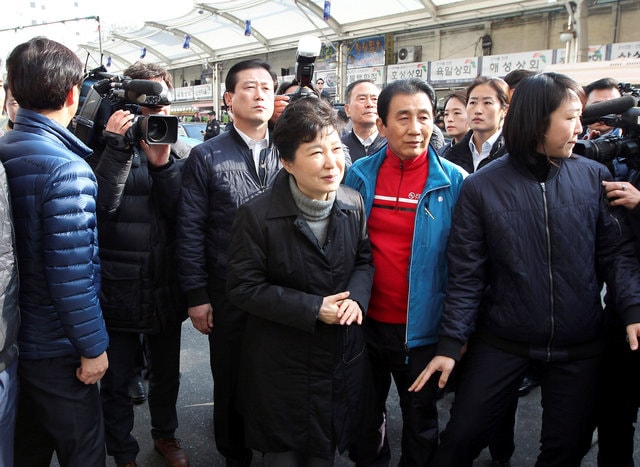 Tổng thống Park Geun Hye xuất hiện lần đầu tiên khi thăm ngôi chợ ở Daegu sau thời gian dài ở ẩn vì bê bối vụ để bạn thân lạm quyền. Photo Courtesy: Reuters