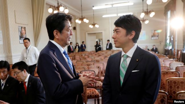 Thủ tướng Shinzo Abe (trái) và nhà lập pháp trong đảng của ông, Shinjiro Koizumi – cũng là con trai của cựu Thủ tướng Junichiro Koizumi, gặp mặt sau một buổi thảo luận tại quốc hội ở Tokyo hôm 28/9/2017. Ông Abe sẽ đưa ông Koizumi trẻ vào nội các của ông. Photo courtesy: Reuters Thủ tướng Nhật Bản Shinzo Abe sẽ đưa con trai của cựu Thủ tướng Junichiro Koizumi vào nội các của ông và giữ các đồng minh ở các vị trí quan trọng trong cuộc cải tổ nội các vào ngày 11/9, giữa lúc chính phủ của ông Abe đang chuẩn bị kế hoạch tăng thuế và sửa đổi hiến pháp hòa bình.