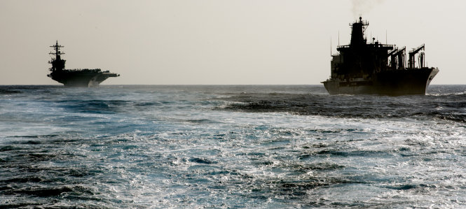 Tàu sân bay USS Carl Vinson (trái) và tàu hậu cần, tiếp liệu USNS Guadalupe ngày 18.2. Photo Courtes: Hải quân Mỹ