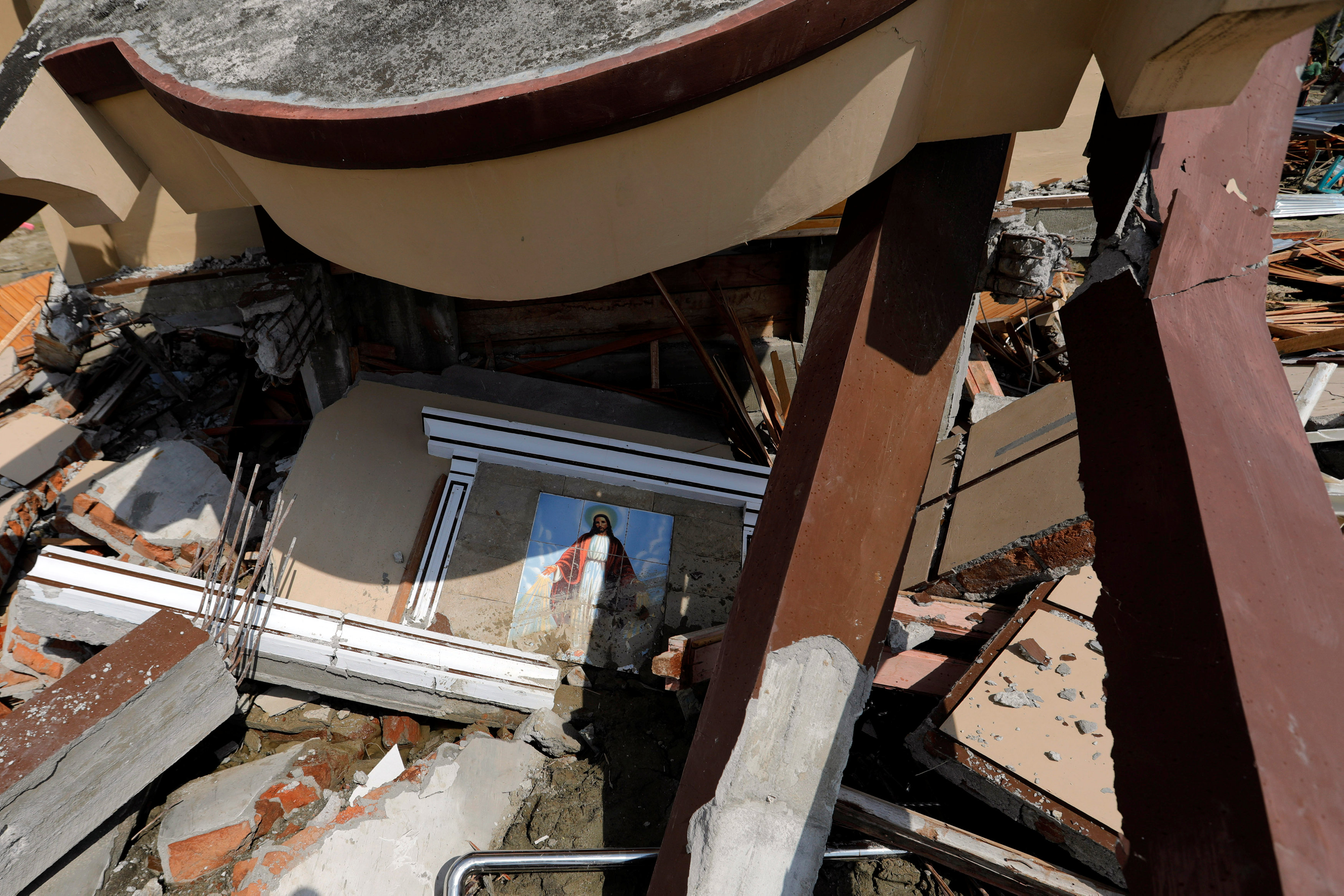Tượng Chúa Jesus nằm dưới đống đổ nát của nhà thờ. Photo Courtesy: Reuters