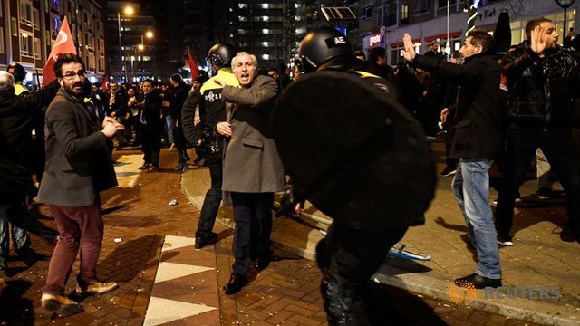 Đụng độ giữa cảnh sát và người biểu tình trước lãnh sự quán Thổ Nhĩ Kỳ tại Hà Lan. Photo Courtesy: Reuters Thổ Nhĩ Kỳ mới đây đã ra lệnh cấm hơn 100 công dân Hà Lan xuất cảnh sau khi những người này công khai chỉ trích Tổng thống Recep Tayyip Erdogan.