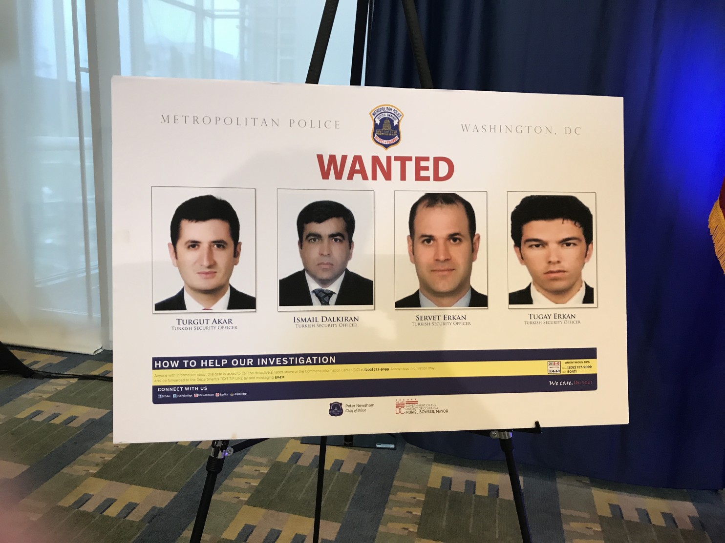 Bốn thành viên trong đội bảo vệ Tổng thống Erdogan đang bị lệnh bắt giữ vì bị cáo buộc tham gia một vụ xô xát tại Mỹ hồi tháng trước. Photo courtesy: D.C.Poilce