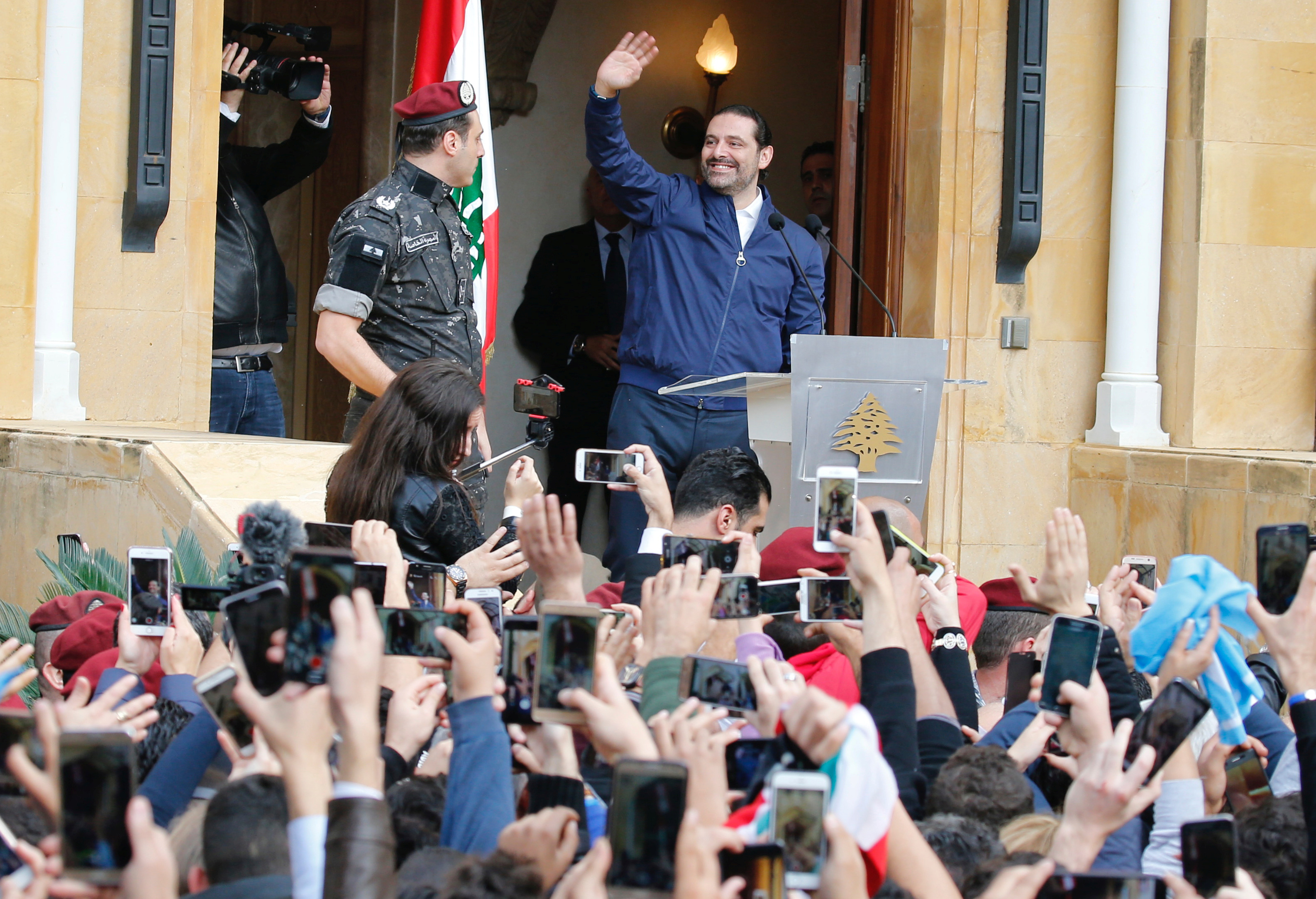 Thủ tướng Lebanon vẫy tay chào người dân khi ông trở về nhà sau khi quyết định từ chức. Photo Courtesy: Reuters Thủ tướng Li Băng Saad al-Hariri tuyên bố hủy bỏ tuyên bố từ chức, tháo ngòi cuộc khủng hoảng kéo dài suốt 1 tháng trời.
