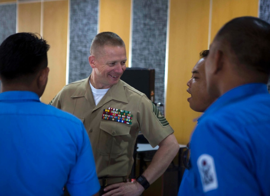 Thượng sĩ Timonthy J. Rudd nói chuyện cùng các thành viên quân đội Hoàng gia Mã Lai vào ngày 24.2.2016. Photo Courtesy: ISMAEL PENA/U.S. MARINE CORPS