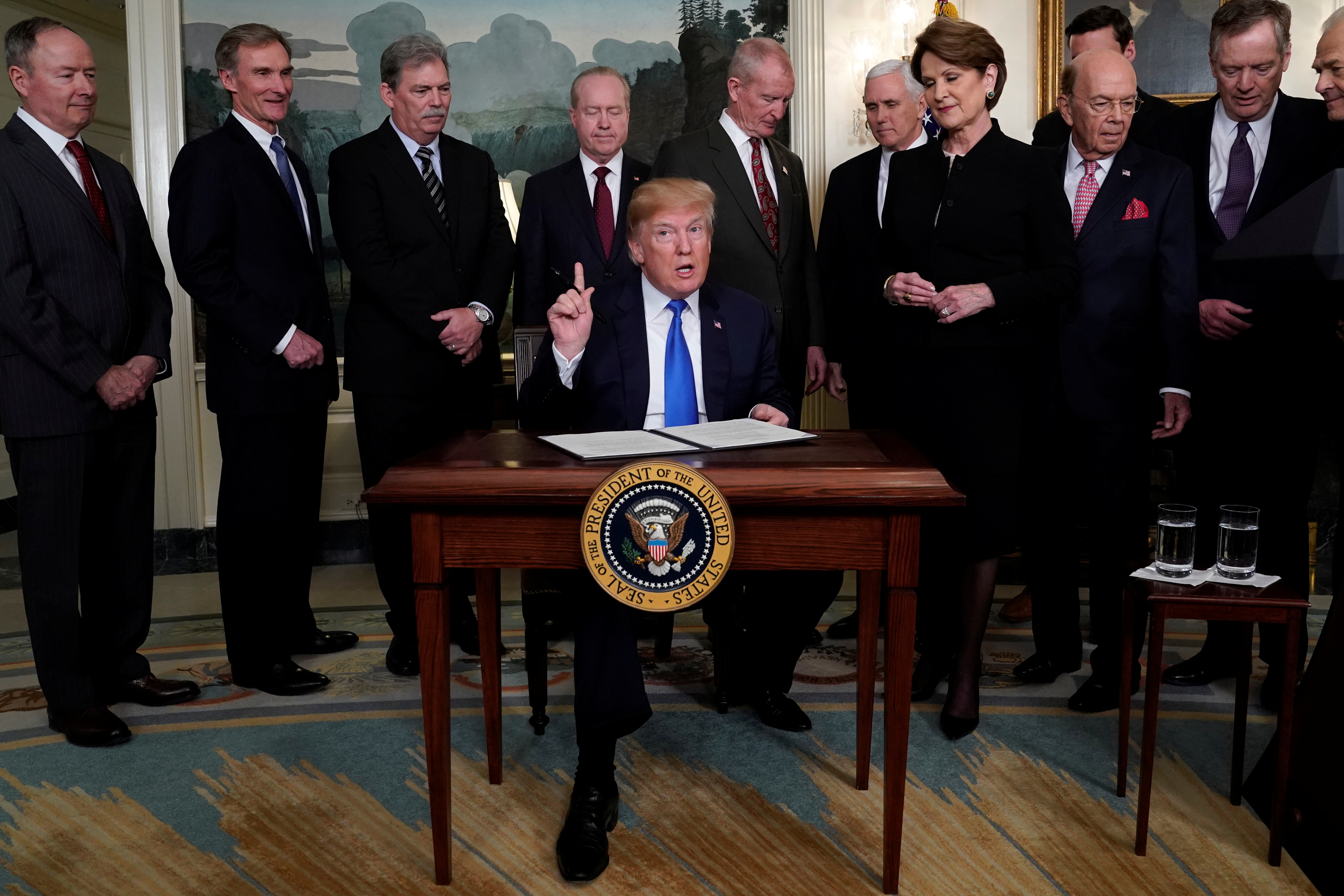 Tổng thống Mỹ Donald Trump ký quyết định đánh thuế trừng phạt Trung Quốc hôm 22.3. Photo Courtesy: Reuters Tổng thống Donald Trump hôm 22.3 đã thực hiện các bước đi đầu tiên nhằm áp thuế trị giá 60 tỷ Mỹ kim với hàng hóa Trung Quốc và hạn chế việc Trung Quốc đầu tư vào ngành công nghiệp công nghệ Mỹ.