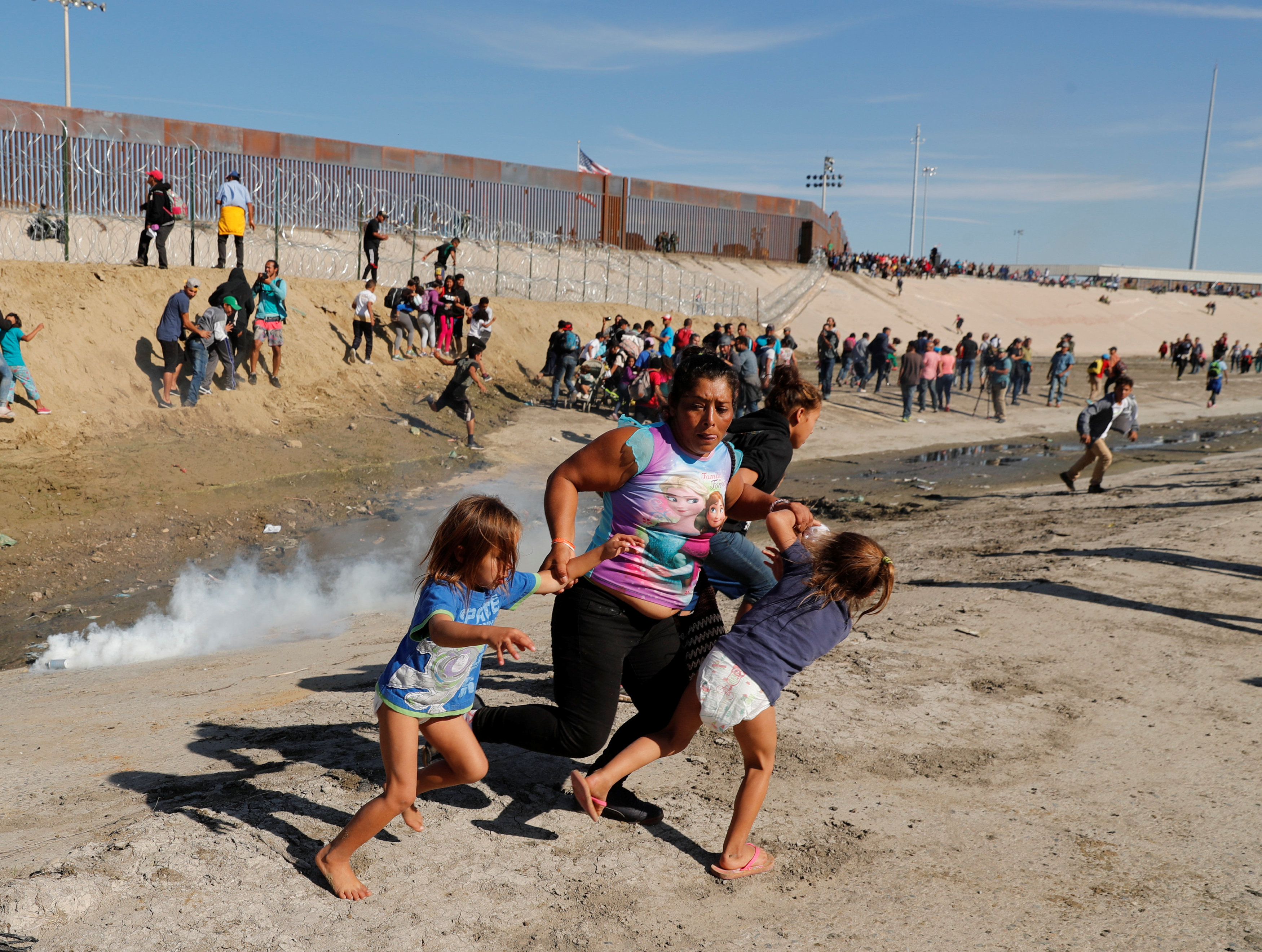 Người di cư vào Mỹ bỏ chạy trong làn khói cay. Photo Courtesy: Reuters