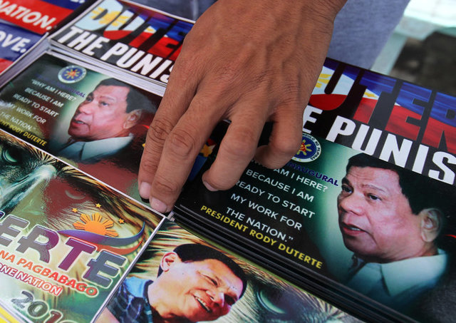 Chân dung Tổng thống Rodrigo Duterte được in trên những tấm thiệp lưu niệm được bày bán tại Davao, Phi Luật Tân. Photo Courtesy: Reuters Tổng thống Phi Luật Tân Rodrigo Duterte tuyên bố sẽ không hợp tác trong cuộc điều tra của công tố viên chống tham nhũng đặc biệt về cáo buộc có tài sản phi pháp.