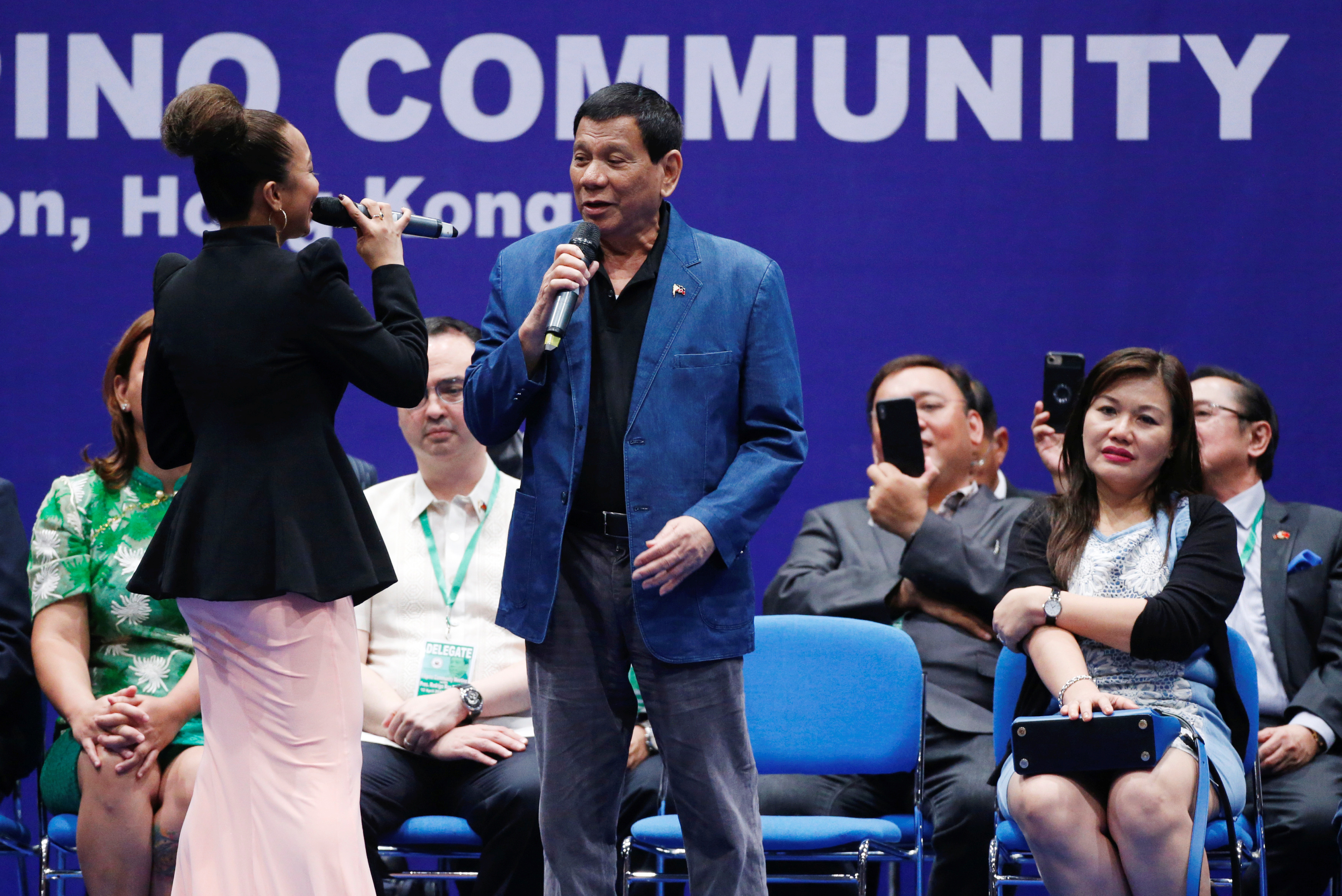 Tổng thống Duterte gặp gỡ người Phi Luật Tân tại Hồng Kông ngày 12.4. Photo courtesy: Reuters Tổng thống Phi Luật Tân Rodrigo Duterte đã công khai xin lỗi Hồng Kông vì vụ bắt cóc con tin ở Manila năm 2010 làm 8 du khách Hồng Kông thiệt mạng.
