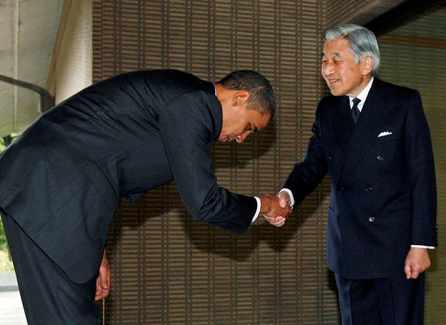 Cựu Tổng thống Barack Obama từng bị chỉ trích vì cúi người trước Nhật hoàng Akihito. Photo Courtesy: Reuters