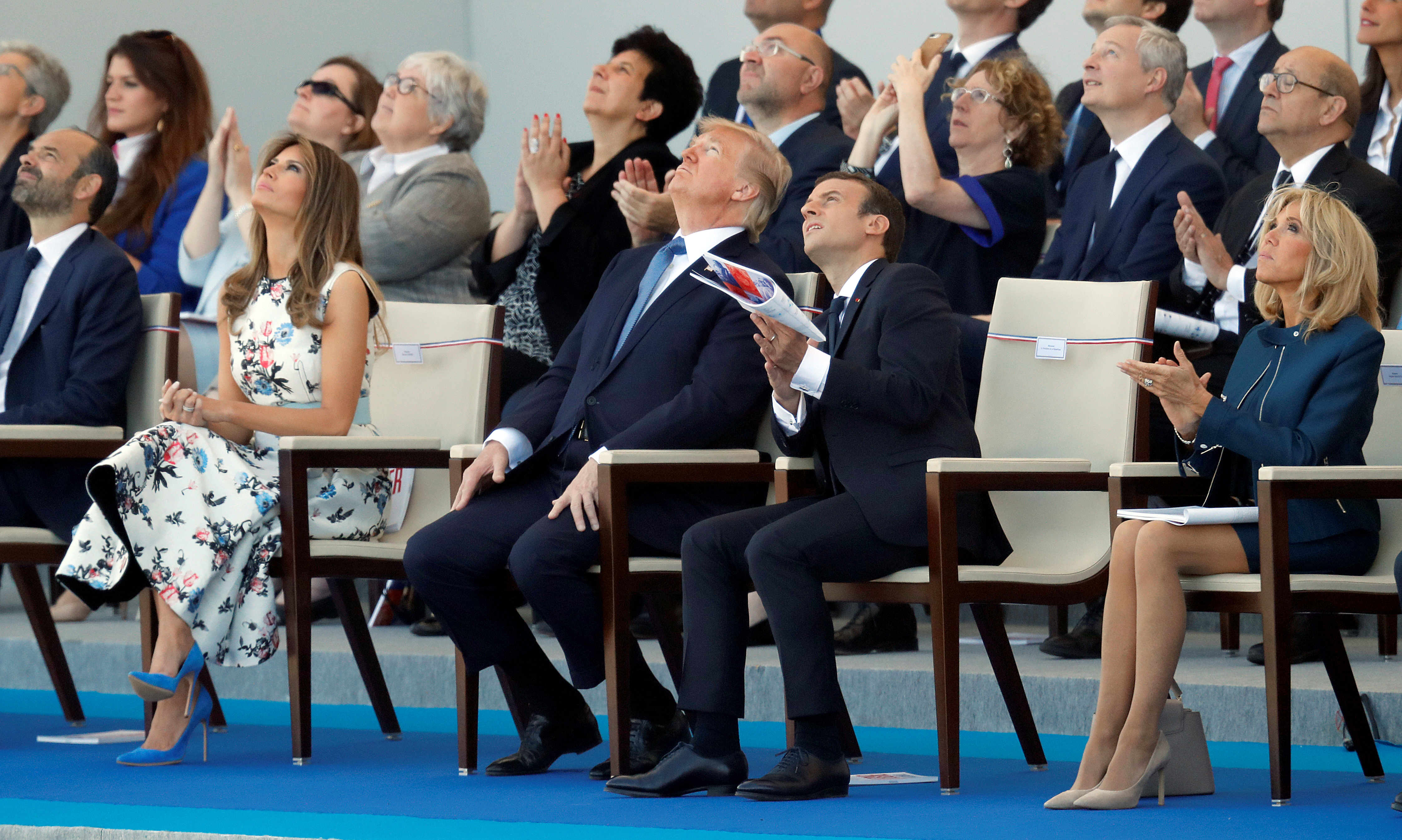 Lãnh đạo Mỹ, Pháp chứng kiến màn trình diễn của các tiêm kích trong lễ Quốc khánh Pháp năm 2017. Photo Courtesy: Yves Herman/Reuters Tổng thống Mỹ Donald Trump muốn có một cuộc diễu binh ở thủ đô Washington vào ngày Quốc khánh Mỹ 4.7.