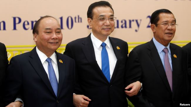 Thủ tướng Trung Quốc Lý Khắc Cường (giữa) cùng Thủ tướng Việt Nam Nguyễn Xuân Phúc (trái) và Thủ tướng Campuchia Hun Sen tham dự cuộc họp Hợp tác Lan Thương-Mekong lần 2 tại Phnom Penh tháng 10/2018. Photo courtesy: Reuters