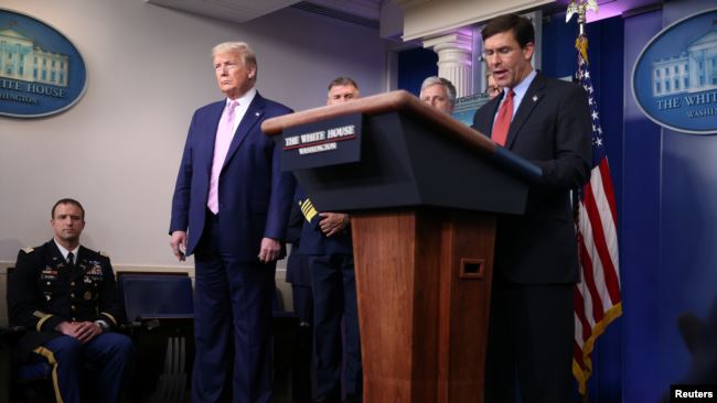 Bộ trưởng Quốc phòng Hoa kỳ Mark Esper nói về những động thái quân sự của Mỹ chống Venezuela, 1/4/2020. Photo courtesy: REUTERS/Tom Brenner