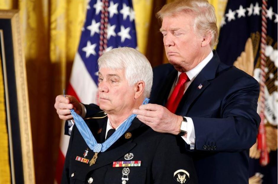 Tổng thống Donald Trump trao Huân chương Danh dự, còn gọi là Danh dự Bội tinh cho ông Jim McCloughan, một cựu quân nhân Mỹ từng tham chiến ở Việt Nam, hôm thứ Hai 31.7 được. Photo Courtesy: Reuters