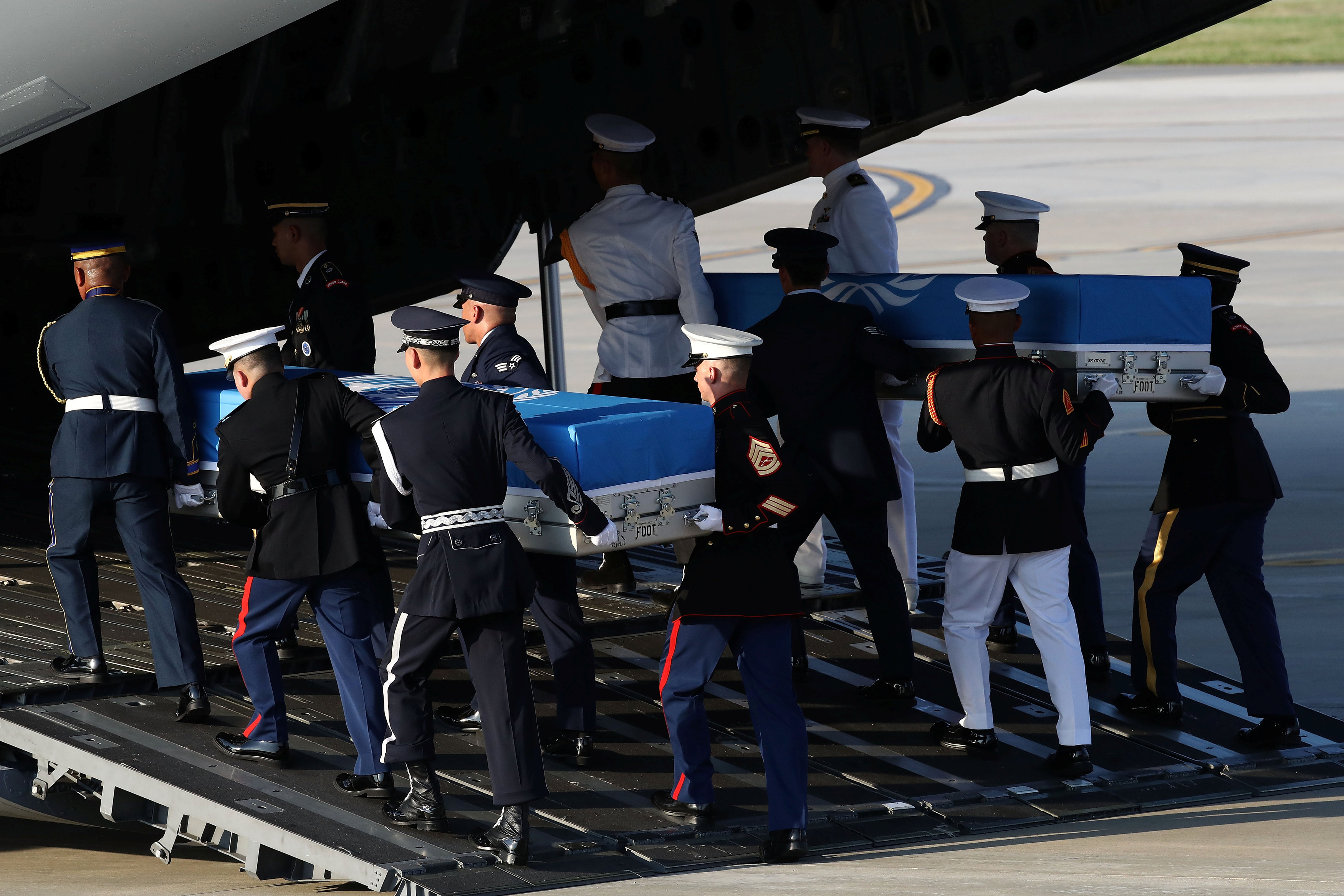 55 bộ hài cốt được đặt trong các quan tài bằng kim loại đã được chuyển lên máy bay vận tải của Mỹ và dự kiến sẽ được đưa đến căn cứ quân sự chung Hickam ở Hawaii để tiến hành quy trình xác định danh tính.