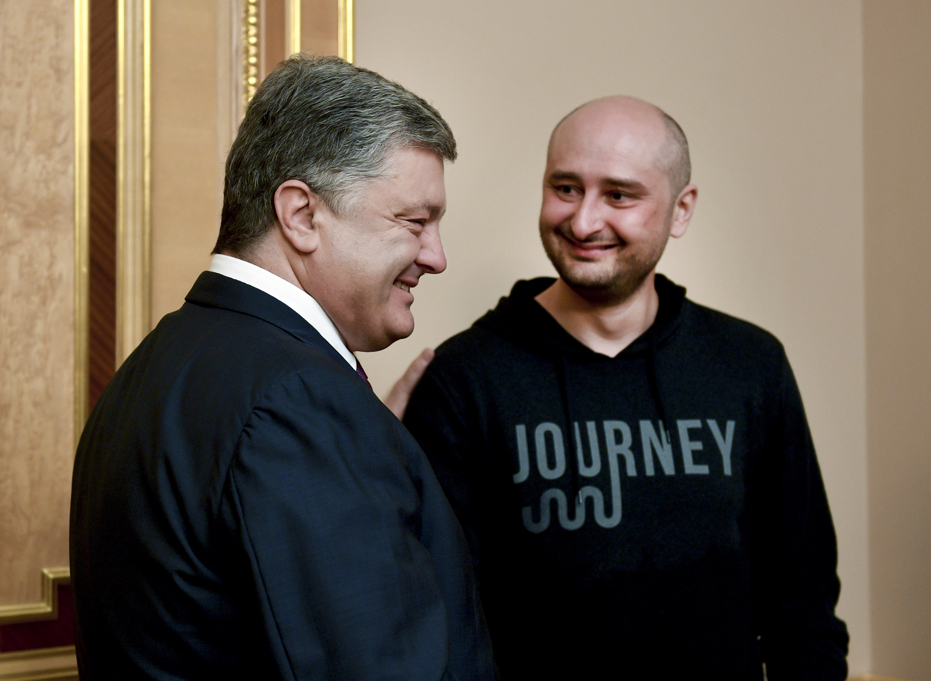 Arkady Babchenko (phải) và Tổng thống Ukraine Poroshenko xuất hiện tại Kiev ngày 30.5.2018. Photo Courtesy: Reuters Nhà báo Nga Arkady Babchenko, người được truyền thông đưa tin đã bị sát hại ở Kiev hôm thứ Ba, vẫn còn sống và đang khỏe mạnh.