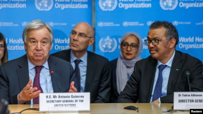 Tông thư ký Liên hiệp quốc Antonio Guterres (trái) và Tổng giám đốc Tổ chức Y tế Thế giới (WHO) Tedros Adhanom Ghebreyesus (phải) trong cuộc họp báo về COVID-19 tại trụ sở của WHO ở Geneva, Thụy Sĩ, ngày 24/2/2020. Photo courtesy: Reuters