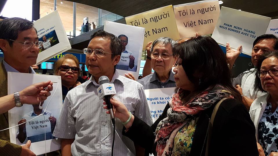 Ông Phạm Minh Hoàng trả lời phỏng vấn tại phi trường Charles de Gaulle, ngay sau khi bước ra khỏi máy bay. (Hình: Facebook Michel Tran Duc) Phạm Minh Hoàng, một nhà hoạt động dân chủ bị Việt Nam tước quốc tịch và trục xuất hồi tháng 6 năm nay, là một trong số những cá nhân và đoàn thể được đề cử Giải thưởng Tự do Báo chí 2017 của tổ chức Phóng viên Không Biên giới RSF.