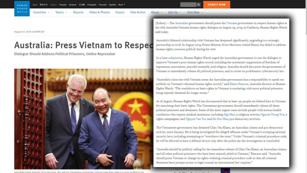 HRW cũng kêu gọi chính phủ Australia thúc ép Việt Nam trả tự do ngay cho tất cả tù chính trị và sửa đổi luật an ninh mạng có vấn đề.
