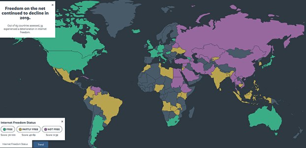 Theo báo cáo của Freedom House, tính từ tháng 6 năm 2018 có 33 quốc gia được đánh giá giảm giá trị về tự do internet. Một số nước bị xếp hạng liên tục không có tự do internet trong 9 năm liền bao gồm Brazil, Bangladesh, Zimbabwe, Sudan và Kazakhstan.