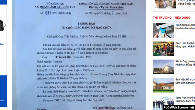 Thông báo của Bộ Công an về việc từ chối cho phép Luật sư Trần Vũ Hải bào chữa cho ông Trương Duy Nhất. Photo courtesy: RFA Cơ quan Cảnh sát Điều tra (CSĐT) Bộ Công an vừa chính thức thông báo từ chối cho phép Luật sư Trần Vũ Hải làm luật sư bào chữa cho nhà báo-blogger Trương Duy Nhất, người hiện đang bị giam giữ để điều tra trong vụ án liên quan đến cáo buộc vi phạm về nhà, đất công sản tại Đà Nẵng khi ông Nhất còn là Trưởng đại diện Văn phòng báo Đại Đoàn Kết của khu vực miền Trung.