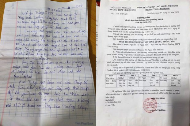 Thư tuyệt mệnh của em Y. và Thông báo của trường THPT Vĩnh Xương. Photo courtesy: RFA