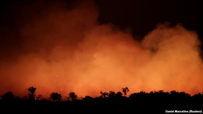 Khói bốc lên từ một đám cháy ở rừng nhiệt đới Amazon ở Brazil hôm 17/8. Các lãnh đạo của Đức và Pháp cùng kêu gọi khối G7 tập trung thảo luận thảm họa này tại cuộc họp sắp tới. Photo courtesy: Reuters Brazil sẽ từ chối đề nghị của nhóm G7 viện trợ 20 triệu đôla để khắc phục hậu quả các vụ cháy rừng Amazon, CNN dẫn nguồn từ trang tin G1 Globo cho biết hôm 27/8.