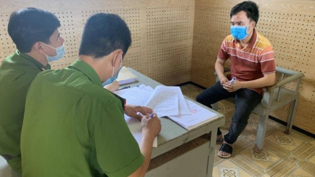 Ông Nguyễn Tiến Sỹ tại cơ quan công an. Photo courtesy: Công an Quảng Bình Công an tỉnh Quảng Bình vừa khởi tố bị can đối với ông Nguyễn Tiến Sỹ, cán bộ Sở Tài nguyên và Môi trường, về tội lừa đảo chiếm đoạt tài sản. Báo Nhà nước đưa tin hôm 7 tháng 5 năm 2021.