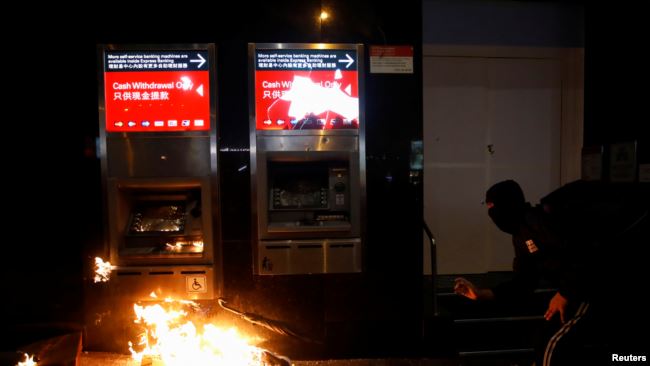 Một người biểu tình Hong Kong đang đập phá máy ATM trong cuộc tuần hành năm mới ở Hong Kong. Photo courtesy: Reuters Cảnh sát Hong Kong đã bắt giữ khoảng 400 người trong các cuộc biểu tình vào ngày đầu năm sau khi cuộc tuần hành lúc đầu ôn hòa của hàng chục ngàn người đã leo thang thành hỗn loạn và cảnh sát đã bắn hơi cay để giải tán đám đông.