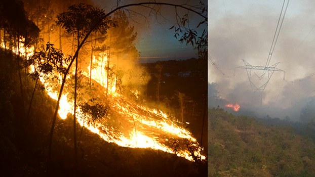 Cháy rừng tại Thừa Thiên Huế và trụ điện cao thế bị lửa bao chùm. Photo courtesy: thuathienhue.gov.vn