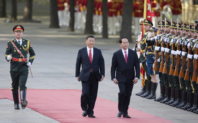 Buổi lễ đón tiếp Chủ tịch Trần Đại Quang tại Đại Sảnh đường Nhân dân ở Bắc Kinh ngày 11.5.17. Photo Courtesy: Reuters Lãnh đạo hai nước Việt-Trung ngày 11.5 trao đổi ‘tích cực’ về vấn đề Biển Đông, không bên nào chỉ trích bên nào, theo loan báo của một nhà ngoại giao cao cấp phía Trung Quốc.