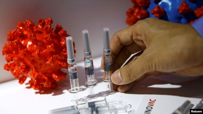 Ứng viên vaccine của hãng Sinovac Biotech Ltd của Trung Quốc được trưng bày tại một gian hàng trong Hội chợ Quốc tế về Thương mại và Dịch vụ của Trung Quốc ở Bắc Kinh. Photo courtesy: Reuters