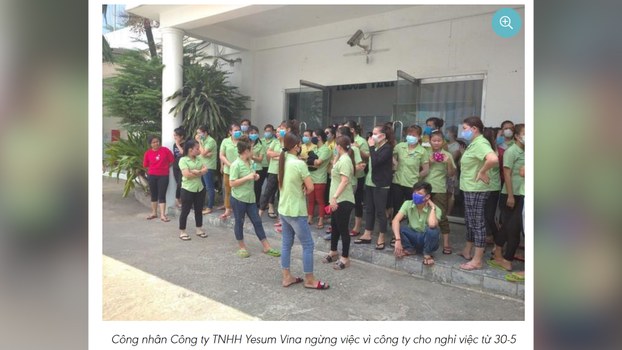 Các công nhân tại công ty Yesum Vina ngưng việc tại nhà máy. Photo courtesy: Nguoi Lao Dong Gần 600 công nhân của công ty Yesum Vina tại Thành phố Hồ Chí Minh vào sáng ngày 20 tháng 4 tiếp tục không làm việc do công ty thông báo sẽ chấm dứt hợp đồng lao động của các công nhân này kể từ ngày 30/05 vì ảnh hưởng của dịch Coronavirus.