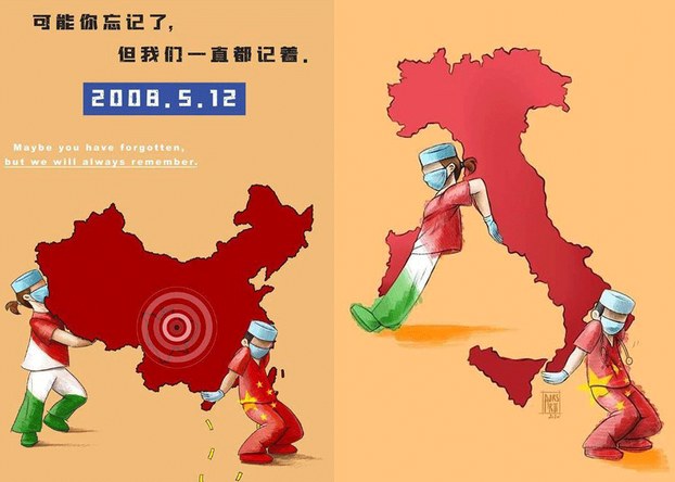 Hai hình bản đồ với đường chín đoạn ở Biển Đông do Trung Quốc tự vẽ ra. Photo courtesy: FB Chinese Embassy in Italy Hôm 16-3-2020, trang Facebook của Đại sứ quán Trung Quốc tại Ý đăng tải 2 hình ảnh với ý nghĩa là, Ý đã giúp Trung Quốc trong dịch SARS hồi năm 2008, Bắc Kinh không bao giờ quên và đến giờ là lúc Trung Quốc giúp lại Ý trong dịch COVID-19