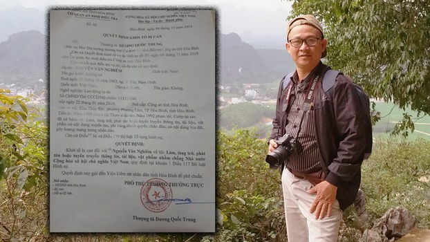 Quyết định khởi tố bị can đối với ông Nguyễn Văn Nghiêm ghi rõ ông: “Làm, tàng trữ, phát tán hoặc tuyên truyền thông tin, tài liệu, vật phẩm có nội dung xuyên tạc, phỉ báng chính quyền nhân dân, có nội dung bịa đặt, gây hoang mang trong nhân dân”.