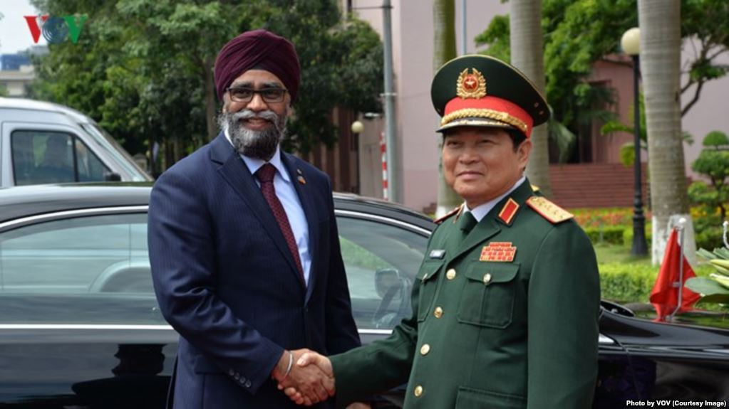 Bộ trưởng Quốc phòng Gia Nã Đại Harjit Singh Sajjan (trái) và Bộ trưởng Quốc phòng Việt Nam Ngô Xuân Lịch tại Hà Nội. Photo trên trang web của VOV Gia Nã Đại vừa cam kết sẽ hỗ trợ đào tạo quân sự cho Việt Nam sau khi Bộ trưởng Quốc phòng Gia Nã Đại Harjit Singh Sajjan hội đàm với Đại tướng Ngô Xuân Lịch tại Hà Nội hôm 5.6.