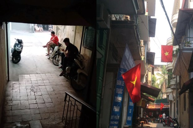 Hình ảnh an ninh mặc thường phục canh nhà bà Trần Thị Thảo ở Hà Nội (bên trái), và một góc phố treo cờ ở Hà Nội. Photo courtesy: Trần Thị Thảo & FB Dao Thu An ninh tăng cường canh gác quanh nhà những người hoạt động xã hội và blogger ở Việt Nam nhân dịp quốc khánh Trung Quốc, ngày 1 tháng 10.