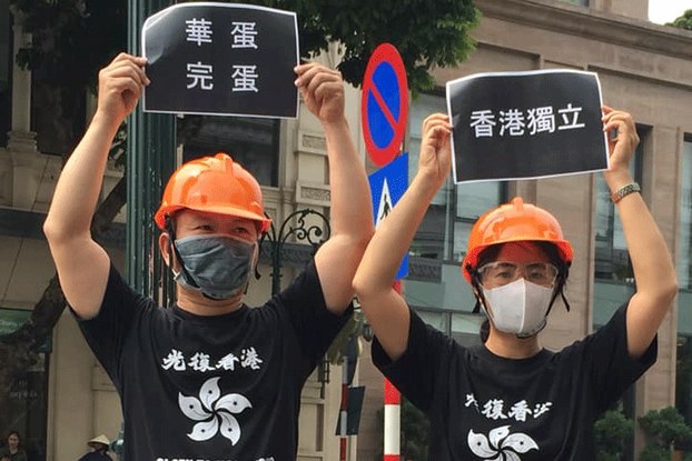 Nhà hoạt động Lê Hoàng đăng tải những hình ảnh chụp được trên Facebook cá nhân cho thấy 2 người bịt khẩu trang và cầm biểu ngữ tiếng Trung có ý nghĩa là: “Trung Hoa tan rã, Hồng Kông độc lập” và mặc áo dòng chữ tiếng anh “Glory to Hong Kong” lược dịch là “Nguyện vinh quang quy Hương Cảng”.