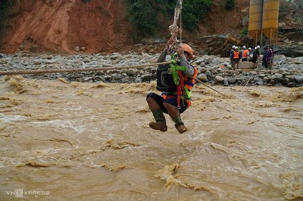 Các công nhân đu ròng rọc vượt sông. Photo courtesy: vnexpress Tính đến trưa ngày 30 tháng 10, đã có hàng chục công nhân trong nhóm hơn 200 công nhân bị cô lập suốt gần hai ngày tại Nhà máy Thủy điện Đăk Mi 2 được giải cứu. Theo truyền thông nhà nước Việt Nam.